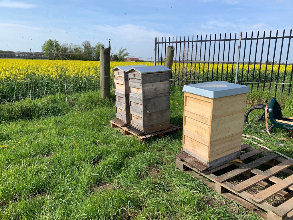 Bei der Rückfahrt von unserem Bienenstand in Naphausen, sind wir an einem Raps Feld im Mackenstein vorbeigefahren. Der Bauer war sofort damit einverstanden das wir einige unserer Bienevölker dort zum sammeln abstellen. In diesem Jahr werde ich also den ersten Raps Sortenhonig erzeugen und wir sind das erste mal mit unseren Völkern aus dem Jubiläumsgarten gewandert. Da auch der Mackenstein in Fahrradentfernung ist konnten wir alles mit dem Lastenrad bewerkstelligen. |