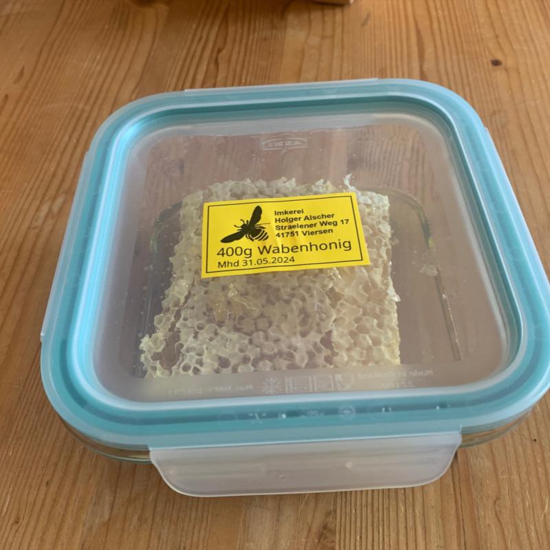 Auch hier versuche ich die Verpackung möglichst Nachhaltig zu gestallten. Es handelt sich dabei um IKEA 365+ Vorratsbehälter. Diese sind auch als Pfandbehältnisse vorgesehen. Je nach grösse liegt der Pfand bei 3,00 4,00 oder 5,00 Euro. Der Wabenhonig selber kostet 2,50 Euro je 100g. Der Wabenhonig ist auch ein sesionales Produkt das ich nicht immer anbieten kann. |